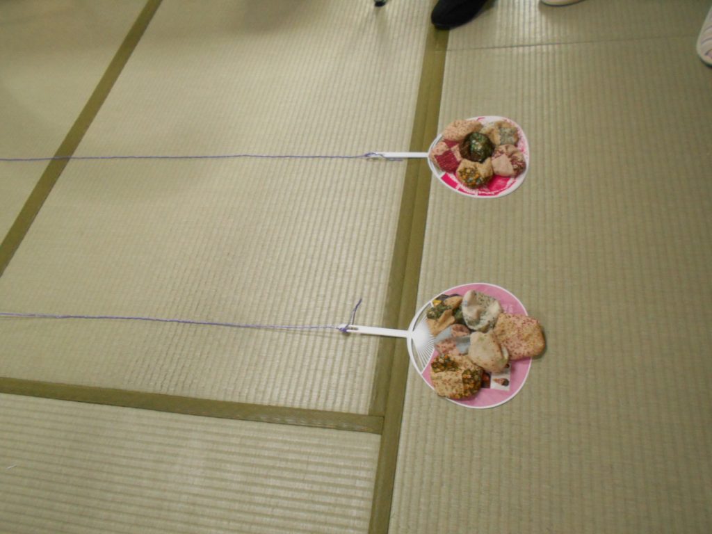 ひものついたうちわにおじゃみをのせて