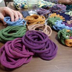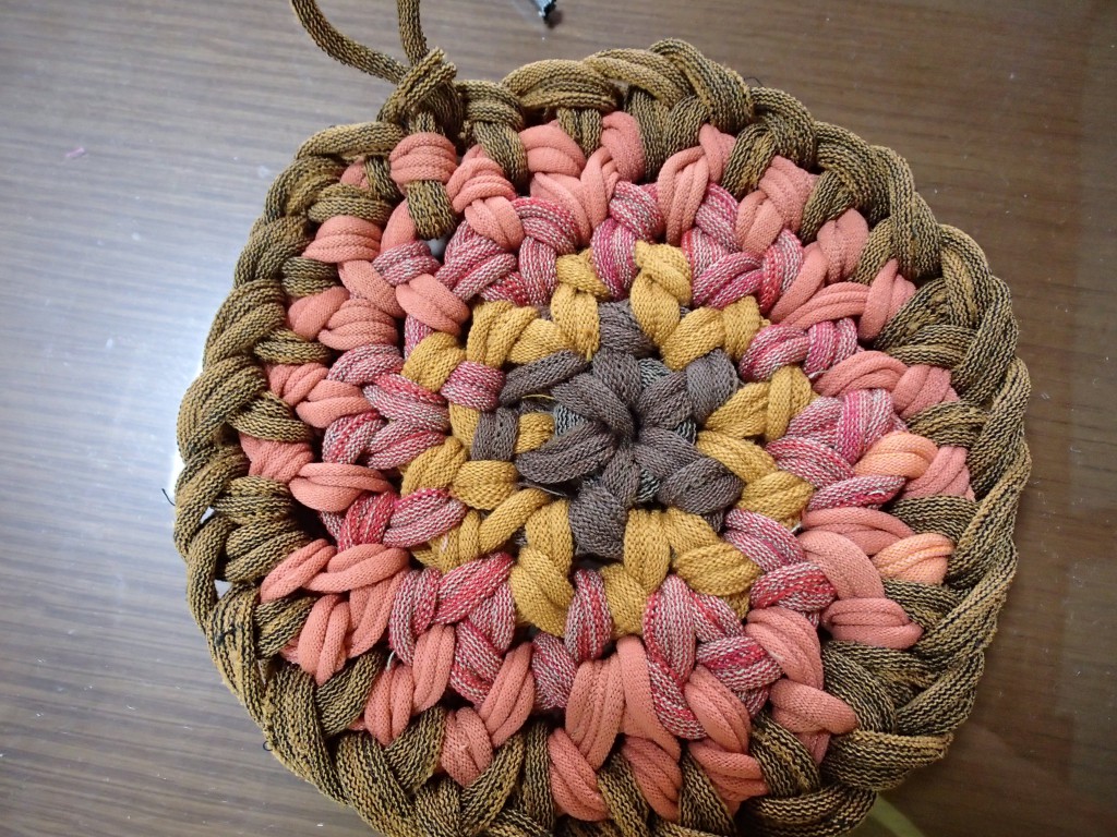 今日はグリーン系のいろいろ糸で座布団始めました。