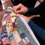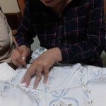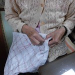 印しつけて、切って、縫って、裏布つけて、キルトをかけて…