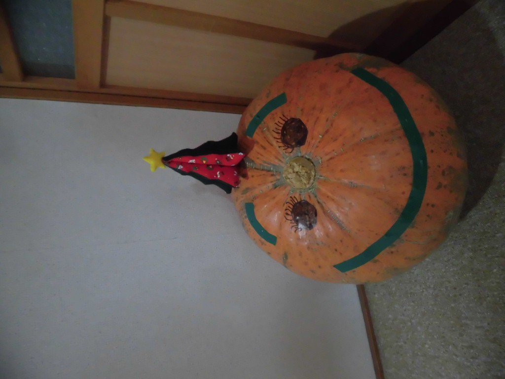 ご近所から頂いた大きなカボチャに顔を描いて・・・